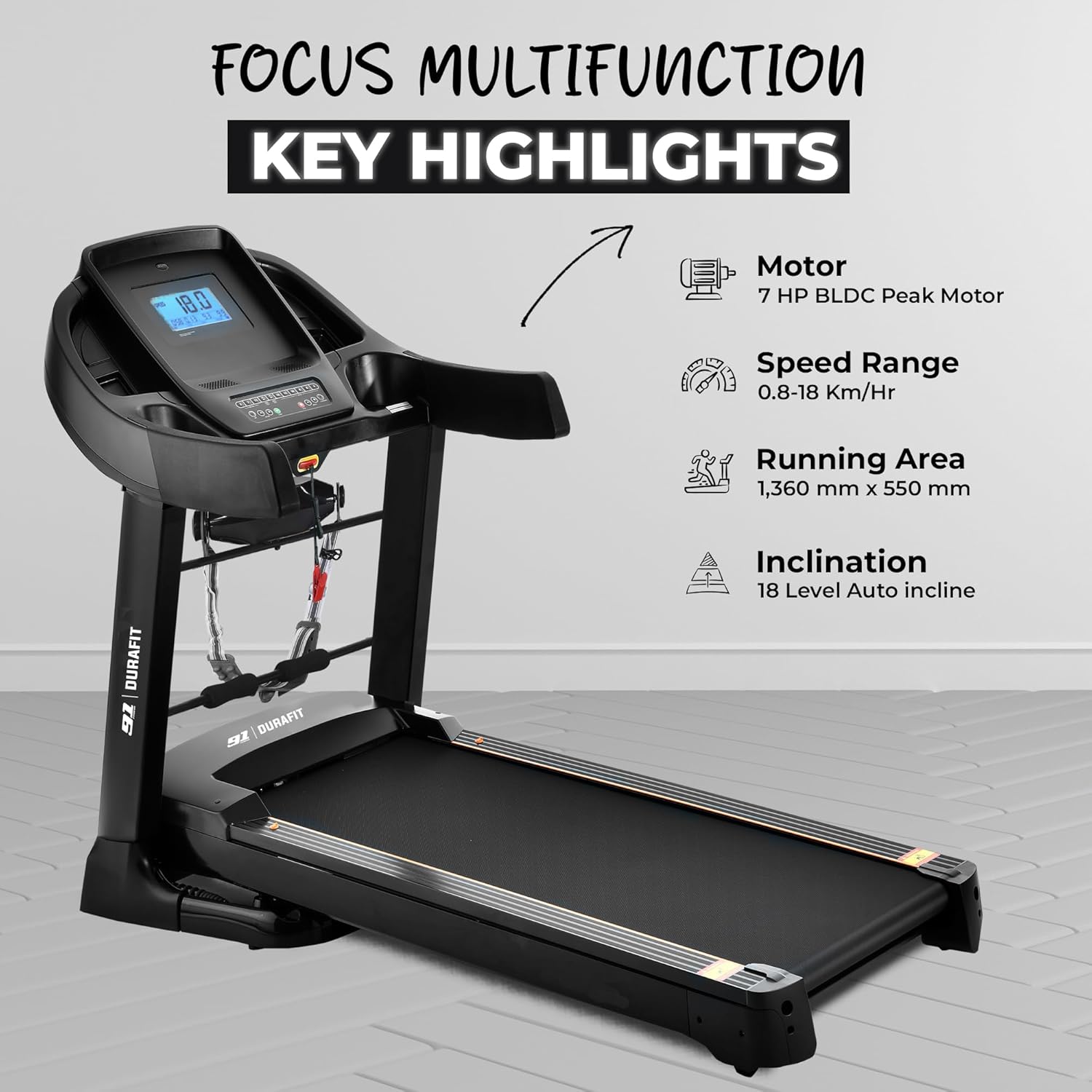 Durafit -Sturdy, Stable and Strong Focus Multifunction7 Hp DcMotorSpeed 18 Km/Hr User Weight 150 Kg Durafit -Sturdy, Stable and Strong Focus Multifunction7 Hp DcMotorSpeed 18 Km/Hr User Weight 150 Kg