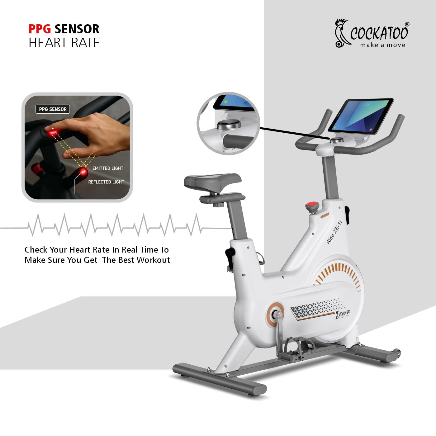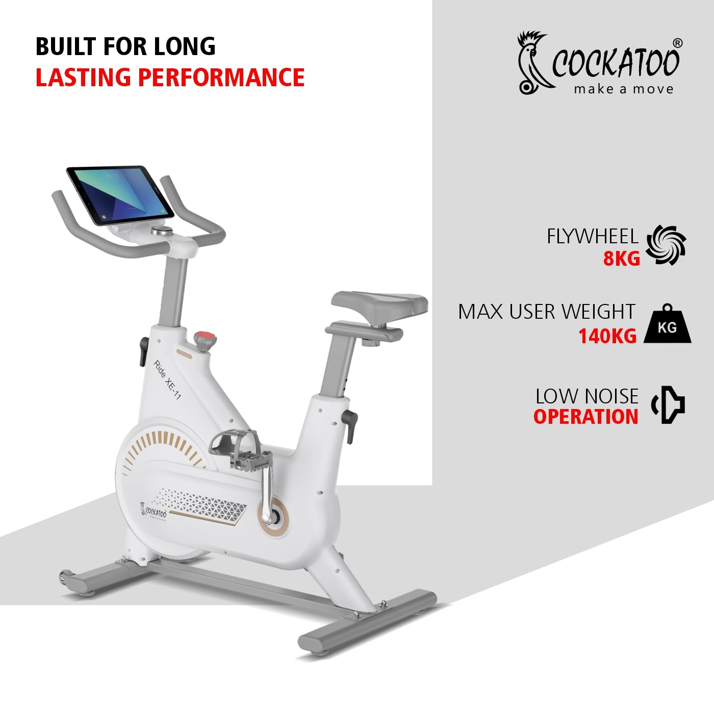 Sturdy & Stylish Build: Crafted from durable steel and plastic, the Ride XE11 spin bike in a premium white & gold finish features a strong, stable frame with belt transmission system, and a compact design that fits perfectly into your home gym setup.