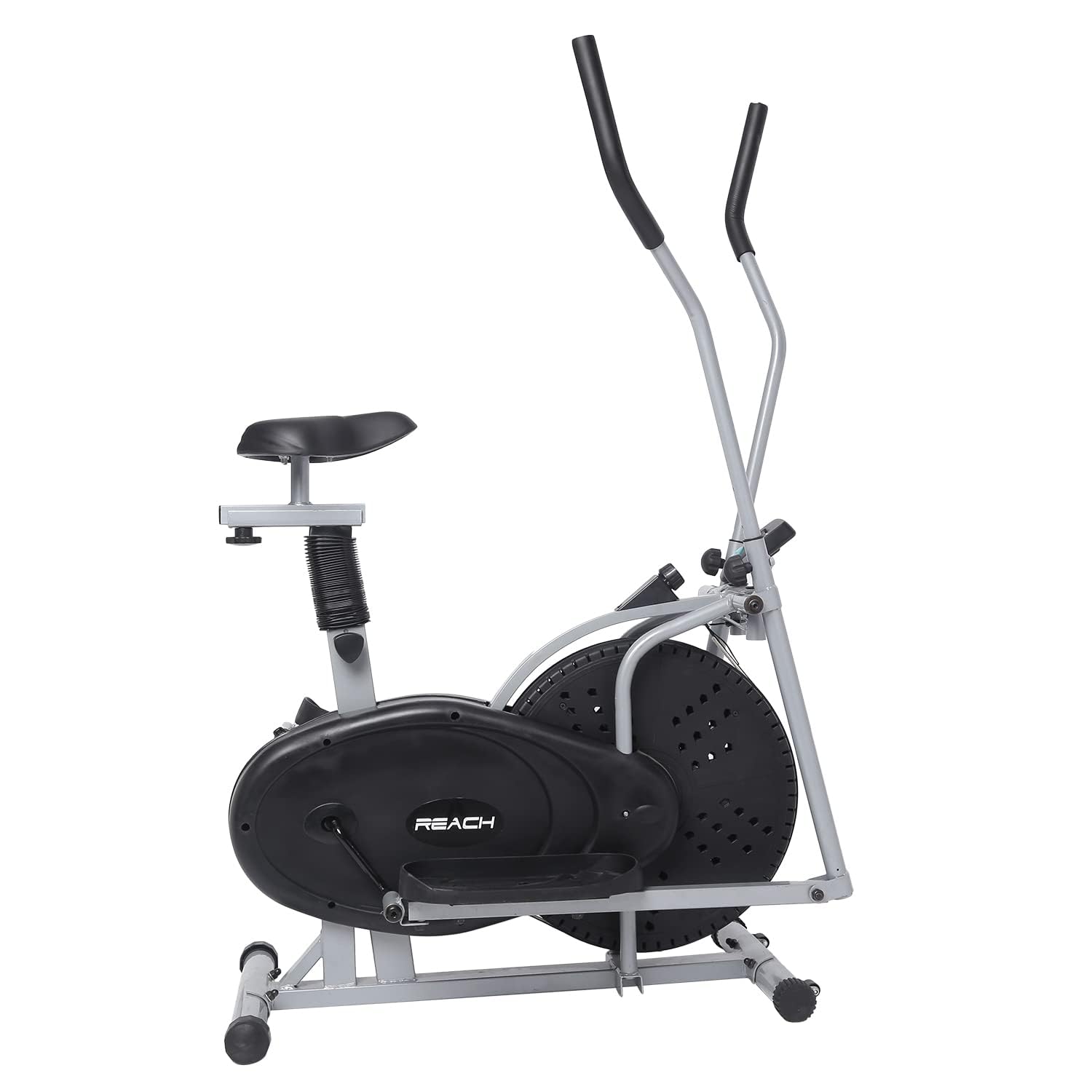 CYCLE + CROSS TRAINER 2-IN-1 FITNESS MACHINE: This dual trainer allows you to use it as a regular elliptical with moving handles, or as an exercise bike by easily changing handle to stationary position using Knob attached. Maximum User Weight-100KG.