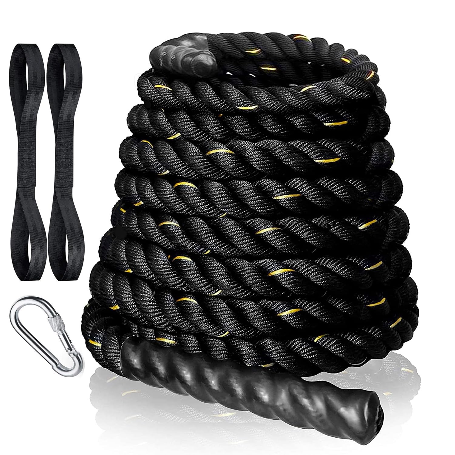 Durable poly dacron with high tensile strength to prevent being loose, breakage or fraying.Covered with high-quality heat-shrink, the handle will be out of shape.Available length: 30-40-50 FT, rope size: 30FT*1.5 IN, suits for different levers for full-body workout.The stainless steel carabiner is portable and movable for indoor/outdoor usage.