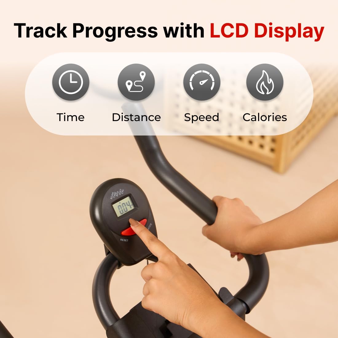 LCD Display for Progress Tracking: LCD screen displays time, speed, distance, calories, and odometer to help you monitor your workout performance.