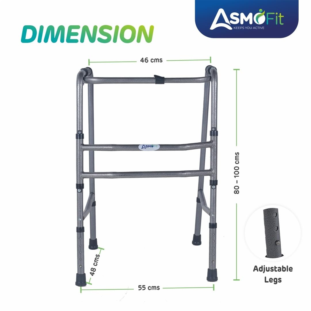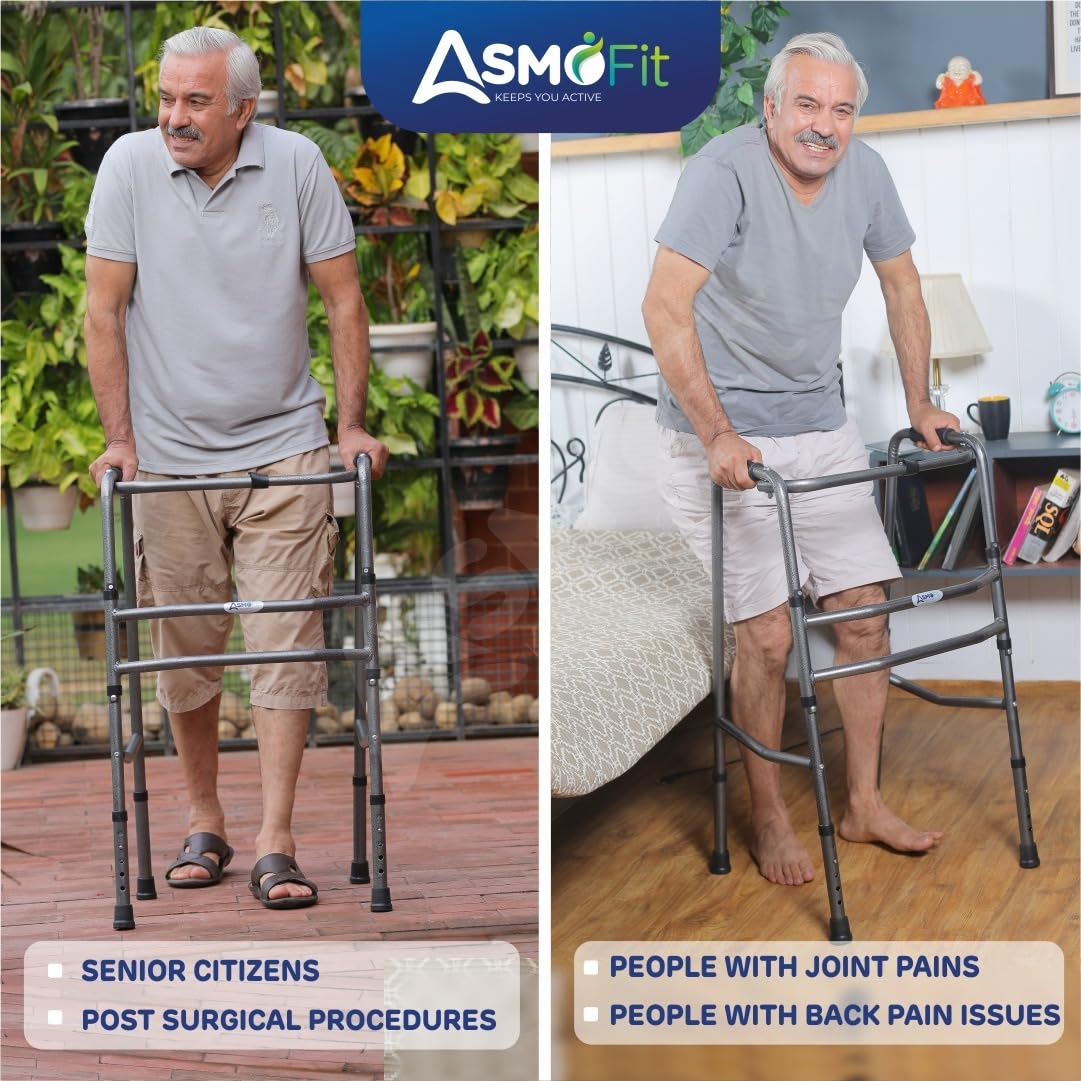 FOLDABLE WALKER :- Made of Heavy Duty Epoxy Coated Hammered Finish. Our Adult walkers Prioritise safety and convenience. They Incorporate push-button mechanisms easily operated by fingers, palms, or even the side of the hand.