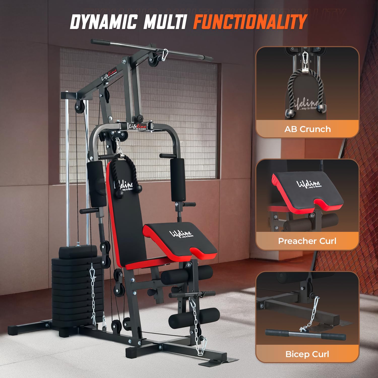 【All-in-One Home Gym】Transform your home into a complete fitness center with the Lifeline multi-function 25-in-1 home gym machine. Unlock over 25+ exercises function including lat pulldown front/back, butterfly, preacher curls, low pulley row, bench press, military press, leg extension & curl, ab crunch, back extension, and many more. Compact all in one home gym machine
