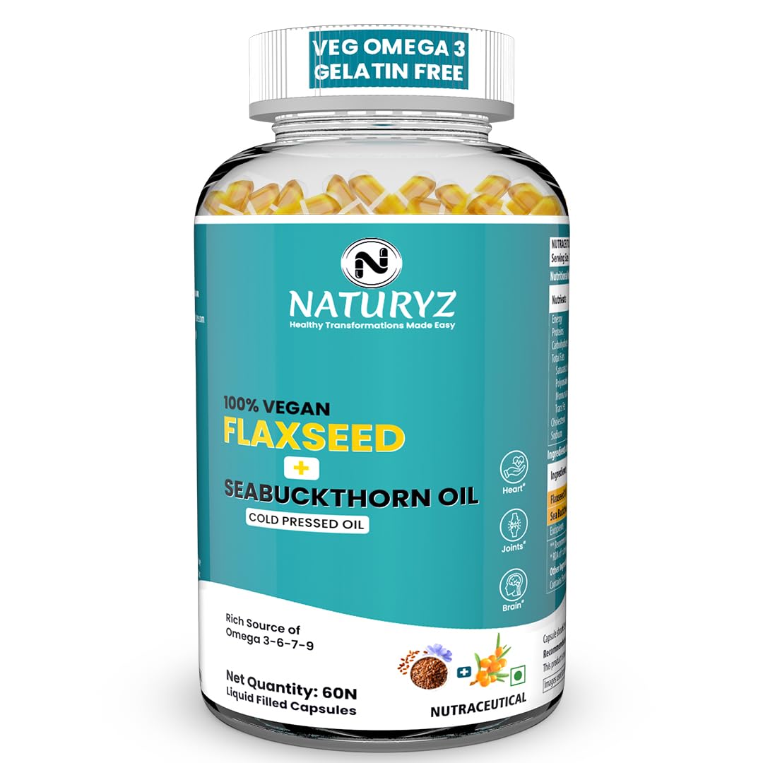 ✅ RICH SOURCE OF FULL SPECTRUM OMEGA 3-6-7-9 FROM A SINGLE CAPSULE: Unlike other plain Flaxseed Oil Capsules, NATURYZ Vegetarian Flaxseed + Sea buckthorn Oil 1120 mg delivers the full range of Omega 3,6,7,9 in a single serving