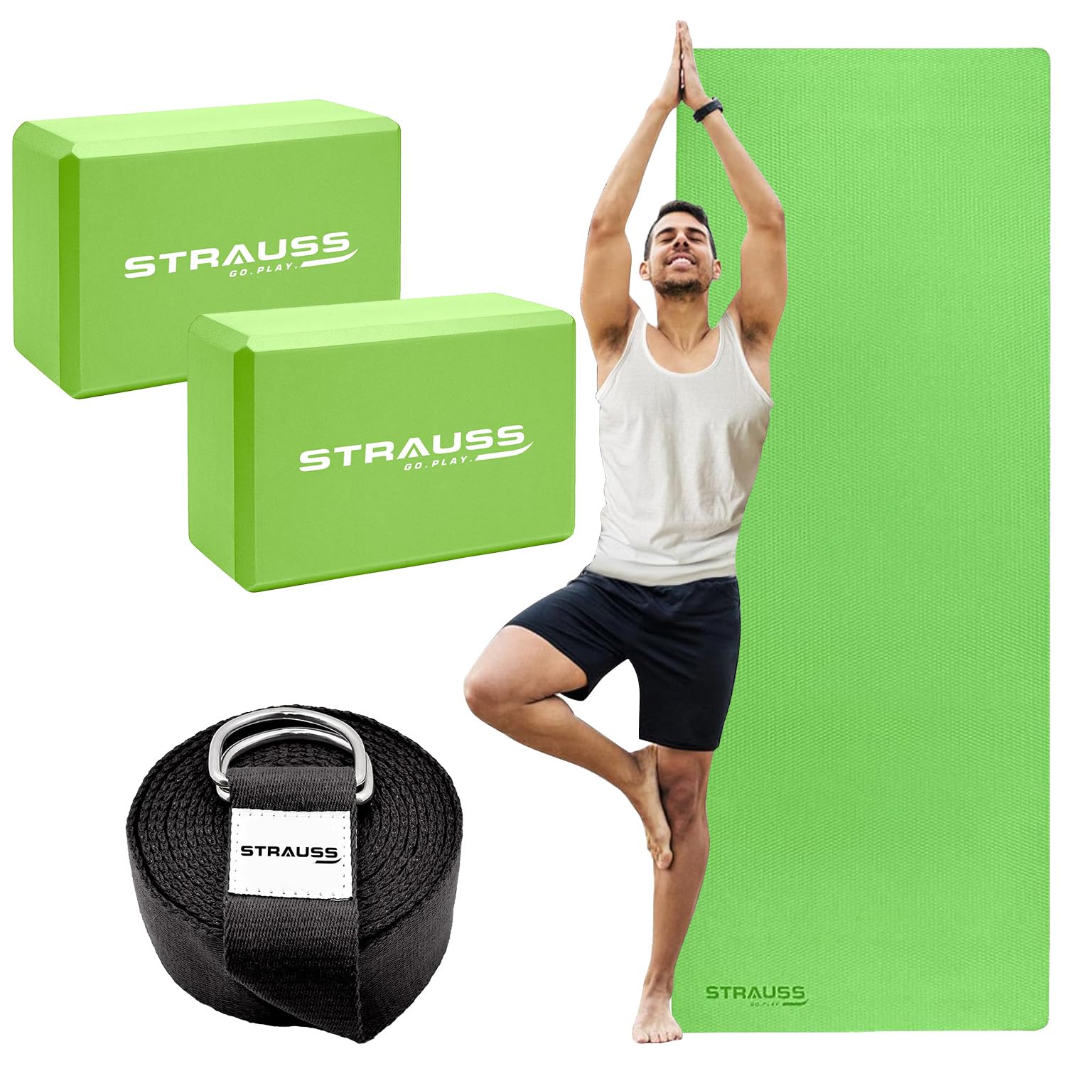 Elevate your yoga and fitness journey with the comprehensive Strauss Yoga Combo Set, meticulously designed for enthusiasts of all levels. This set includes a premium STRAUSS EVA Yoga Mat in a vibrant green, providing an eco-friendly, non-slip surface for all your exercises. Measuring 6mm, it combines comfort with durability, ensuring a stable foundation for your practice, and comes with a handy carry bag for effortless transport and storage. Complementing the mat, the Strauss High Density EVA Foam Yoga Block in matching green enhances your poses by offering the support needed to improve balance, flexibility, and strength. Its non-slip, sturdy design makes it a versatile tool for deepening stretches and mastering difficult poses with confidence. Rounding out the set, the Strauss Yoga Strap & Stretching Belt is a black, eco-friendly accessory designed to enhance your flexibility and range of motion. At 8 feet long and 60% thicker than standard belts, it features an extra-safe adjustable metal D-Ring buckle, catering to a variety of stretches and exercises across yoga, pilates, therapy, dance, gymnastics, and more.Together, these high-quality, durable components provide a complete solution for a fulfilling and effective home or gym workout experience, suitable for both men and women.