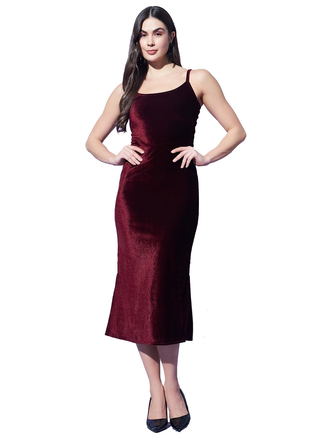 Elevate your eveningwear game with the Vaararo Velvet Sleeveless Maxi Dress for Women, a show-stopping piece crafted for modern glamour. Made from premium, soft-touch velvet, this dress drapes beautifully on the body, offering both comfort and luxury. The sleek black hue brings timeless sophistication, while the rich texture of velvet makes it perfect for festive evenings, cocktail parties, or date nights.The design features a stylish front cut-out detail that adds just the right amount of allure without being too revealing. The slim-fit silhouette hugs your curves gracefully, and the side slit at the hem ensures ease of movement with an added hint of drama. The sleeveless cut and minimalistic neckline keep the look elegant and versatile — allowing you to style it with bold accessories or let the dress shine on its own.