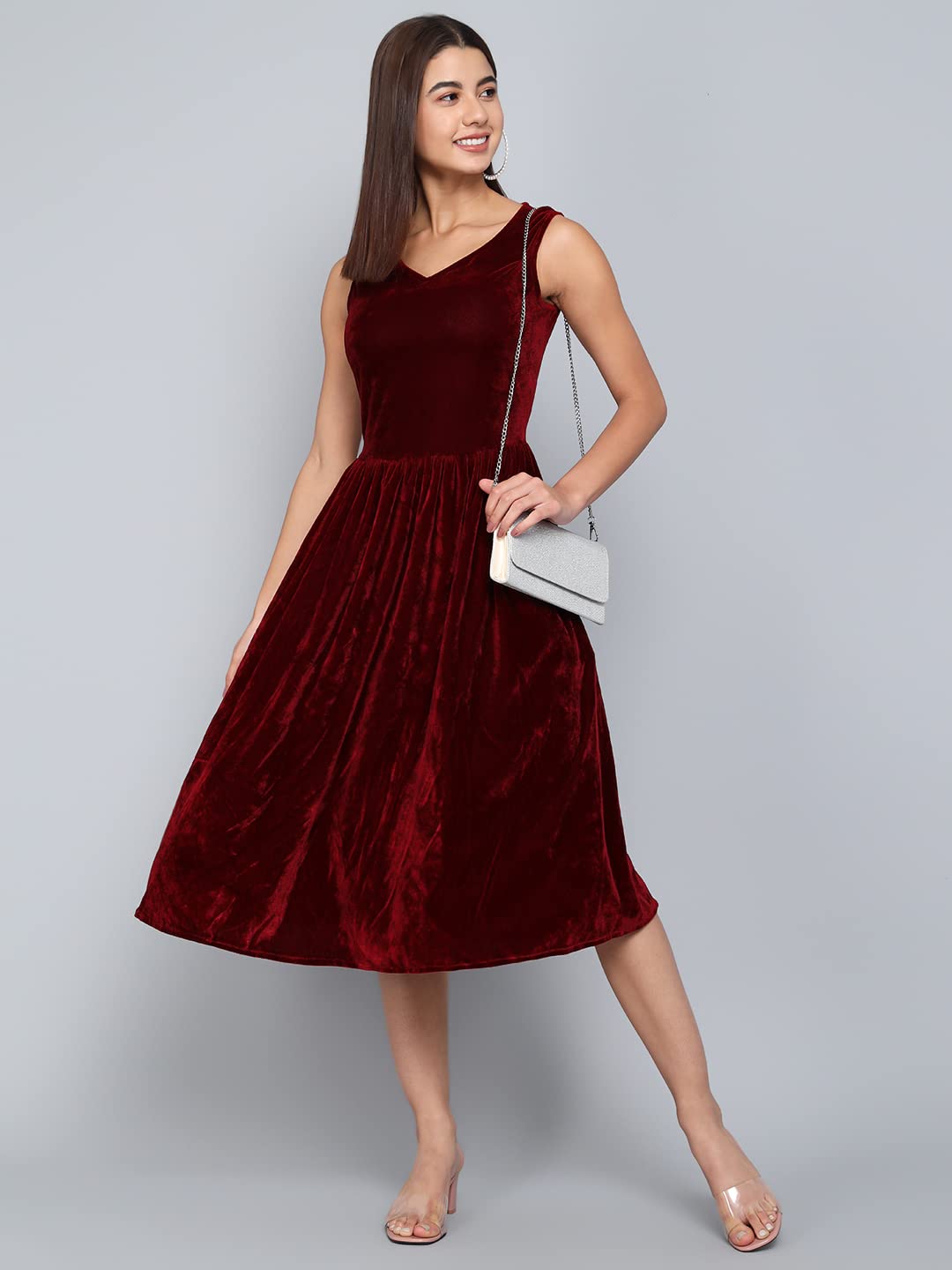 Introducing our sleeveless a-line velvet v-neck party dress, a luxurious and chic ensemble designed to elevate your evening attire. This exquisite dress combines timeless elegance with modern flair, ensuring you make a statement at any special occasion.Crafted from sumptuous velvet fabric, the dress not only exudes opulence but also provides a comfortable and soft feel against your skin. The sleeveless design adds a touch of sophistication, allowing you to showcase your shoulders and collarbone. The A-line silhouette gracefully flows from the fitted bodice, creating a flattering and feminine look that complements various body types.